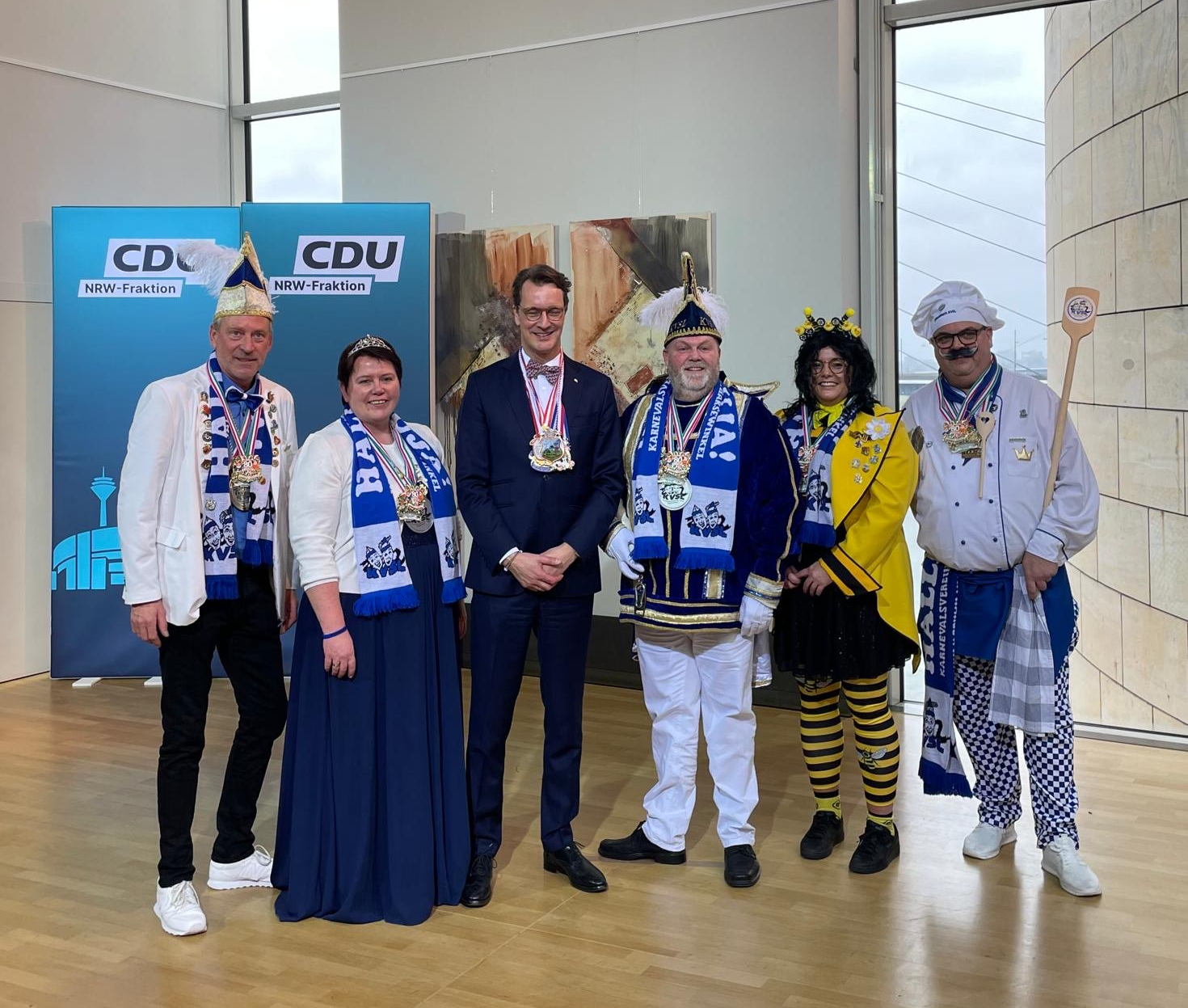 „Bei allem Spaß, den wir haben, ist der Närrische Landtag ein wichtiger Beitrag zur Brauchtumspflege“, sagt Tigges. „Mit dem Närrischen Landtag würdigen wir insbesondere die Arbeit der vielen Ehrenamtlichen, ohne die es weder Karneval noch anderes gesellschaftliches Engagement gäbe. Gerade im Karneval werden die Stärken unserer Demokratie und unseres Föderalismus sichtbar - durch Toleranz, Zusammenhalt, gegenseitiges Engagement und Vielfalt.“ Jeder närrischen Delegation wurde der Sessionsorden 2026 überreicht. Der Orden wurde von dem Düsseldorfer Künstler Jacques Tilly gestaltet, gegen den in Russland ein Strafverfahren wegen Verunglimpfung eingeleitet worden ist. „Die Gäste des Närrischen Landtags nehmen daher mit dem Orden ein Symbol für Meinungsfreiheit, Demokratie und Menschenrechte mit“, so Tigges. Die Karnevalisten aus Harsewinkel hatten auch die Gelegenheit, Ministerpräsident Hendrik Wüst zu treffen, der ihnen seinen Karnevalsorden aushändigte.
